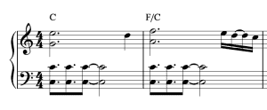 Take a look at the right hand chords. The melody note is on top of the chord, whereas the other notes below are chord tones from the underlying harmony. We call this harmonization.