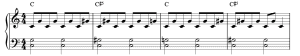 One fundament for groove is the bass performing a certain bass pattern or bass groove. Let’s have a look at the first couple of bars and the bass figure (left hand – bass clef). Dancing Queen starts off with two dotted eighth notes followed by a long sustained note.